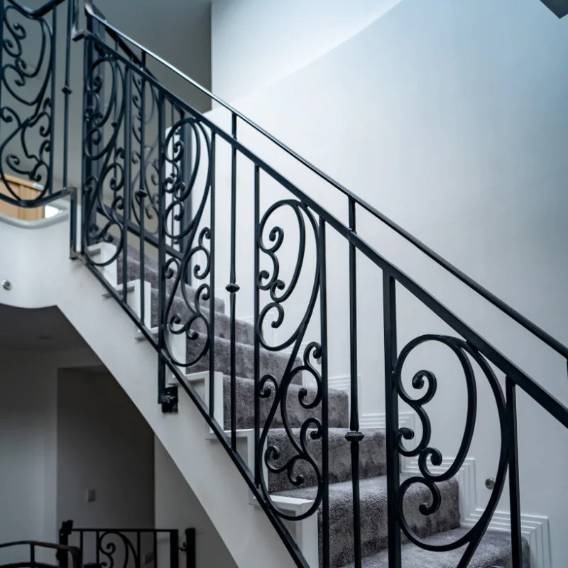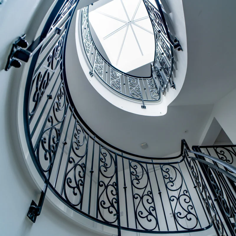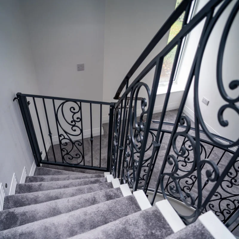Bespoke Stunning 3 tier decorative ornate curved staircase with child safety stair gates, designed, manufactured and fitted by Curtis Metals, beautiful piece of workmanship, finished in anthracite powder coat.